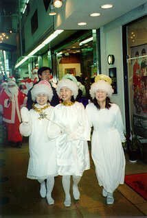 These three very cheerful Japanese angels, complete with balloon halos, were parading through the shopping area, closely followed by a group of Santas, all of them singing Christmas Carols!!! 12/23/97