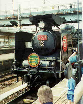 - The interior of the car we first rode in Each of the restored cars is decorated to represent a period in Japanese railway history. This first car we were in was a little austere, but apparently preferred by Japanese businessmen, who eventually crowded us out of our reserved seats! That's OK, though, because the second car, which we were herded into, was nicer anyway :-) It had high-backed green velveteen seats, which were also more comfortable! (Sept. '97)