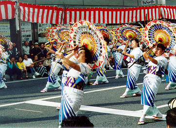 | The white snakes are paraded down the street, and people try to touch them as they go by. Several times along the way, they stop and coil the snakes up together! | There were many dancers... these were dancing while twirling their umbrellas :-) |