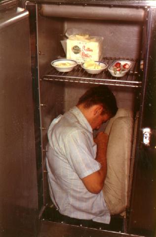 I'm sure everyone in the crew will remember this man's name, but I dont' want to identify him. On more than one occasion, he rented a car, and smashed it into several palm trees in Fort Lauderdale. It seems to me he was forever paying off the bills for damage to cars and trees. This is a shot of him in the reefer in the mess hall, on one of our stops in Key West. Aside from the usual quantity of beer and liquor, I don't know why he removed all of the shelves of fresh fruit to "get comfortable." There's a tow chain draped over his right shoulder. He was in my watch section and was a terrific worker. At sea, he was a hell of a nice guy, he just had a few "unusual habits" whenever he got into port.