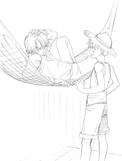 色をつけようと思って取って置いた線画… すでにどういう配色にするか、とか忘れてしまって塗る気が無くなった ので、ここに… 「なぁ、サンジー。起きろ」 腹が減って目が覚めたルフィはハンモックを降りてサンジを起こしに。 昨日倉庫の果物を勝手に食って料理人に怒られたばかり。 勝手に食べない代わりに、真夜中だろうが早朝だろうが構わず彼専属の 料理人を呼ぶ。それは船長である彼にだけ許されたこと。 「ったく仕方ねェな…わかったよ、待ってろ」