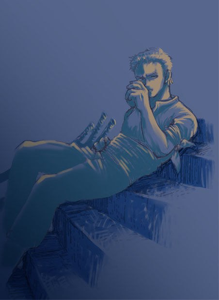 ゾロが夜見張り番の時に、サンジの目を盗んでキッチンから料理用の酒を持ち出した後。
