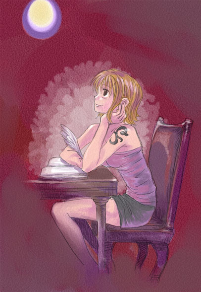 連続でナミですナミ。航海日誌をつけているイメージで…。左上の、窓にしようと 思った…のですが、何なのか描いているうちにわけわからないようになってしまい またもや失敗の予感。あぁぁ、ふがいない… ぽつりぽつりと、船長のことを考えながら日誌をつけている航海士。 そろそろ食料が無くなってきたってサンジ君が言ってたわね…あいつが盗み食い しちゃうから。鍵つき冷蔵庫買ってあげなきゃ。