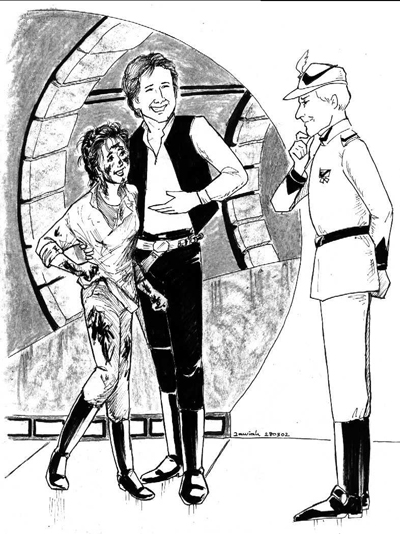 This illustration was done by Zawiah for inclusion in the Star Wars fanzine "Delusions of Grandeur" along with my story. Please tell her what you think of the drawing and don't post this elsewhere without her permission. Be sure to check our Zawiah's website if you like her work!