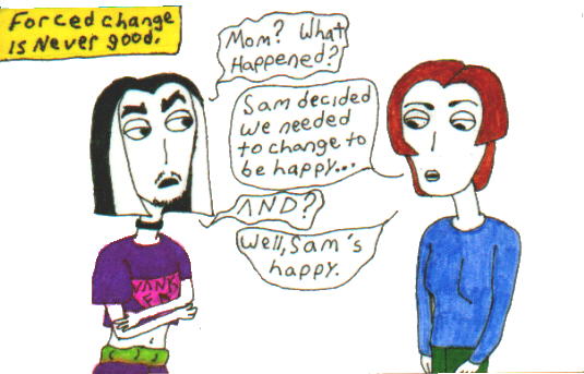 After a while, Willy gets a visitor: It's Wanda and she's changed drastically. Her hair is back to it's natural color. She no longer wears makeup, and she doesn't dress as shockingly as she once did. She reveals that she's changed this way for Sam to make him happy. Unfortunately, she is not happy. She's unsure of what to do...