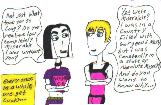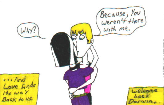 This puts Willy back into a state of depression and the group begins to worry about him. Once more, he never appears outside of his room. And then one day, there's a knock on his door. Something deep inside him tells Willy to answer it. And so he opens the door to find Darwin standing there smiling at him. And he's changed! His hair has grown out of it's military buzz and his body has shaped out quite nicely. Even his clothes seem to fit him better. If Darwin was perfection in Willy's eyes before, he is a God there now.
