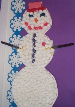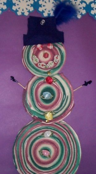 | For the January take home project I sent home 3 white tag board circles and asked each family to make a snowman out of them. As with all take home projects I asked them to be creative and to use things they can find around the house. I have gotten back some very original projects! | ||||||||||||