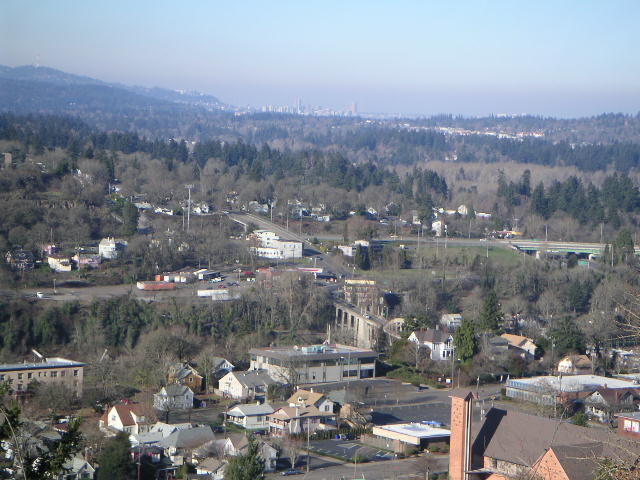 OK for strollers and wheelchairs. Walk up and down to go along the river and through older lovely and historic neighborhoods, Clackamas County Courthouse, Museum, other historic buildings and some great views of the city from the bluff. Restrooms at start/finish and various eateries along the way. Click here to see a short QuickTime movie of the view of Portland and Mt St Helens.