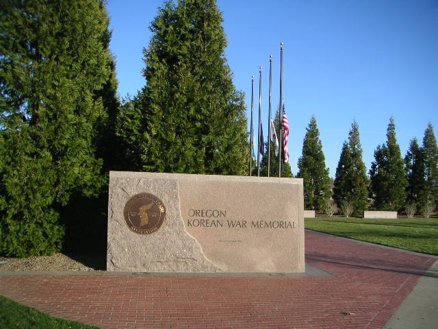that qualify for the Walk Oregon challenge alphabetic letter 'W'. Trail is rated 2. Visit the Korean War Memorial (shown above)and an historic Church. Walk goes through several new areas of lovely homes and gardens. Paths questionable for wheelchairs. OK for strollers. Dogs OK on leash observing good manners.