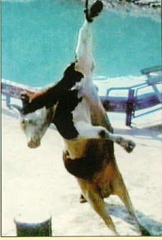 Suspendus à des crochets par une patte, la tête en bas, on leur coupe la gorge.