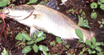 The Barramundi has big scales, a large mouth, humped shoulders, a very deeply scooped forehead, and it's eyes, which are very close together, shine a bright red when hit by artificial light. There are two different colored Barramundi: the Freshwater Barra is dark bronze with brassy flanks and very dark fins and an almost black tail; the Saltwater Barra is very silver in color, and there are no other colors on it except for a purple sheen along the back of their fins and a yellowing of the tail. The Barramundi are born male and stay that way for a few years before becoming a functional female, larger in size than the male. The very big monster Barramundi are probably all gone by now. I have seen pictures of Barramundi that weigh 50 kilos; now the average size Barra taken is between 1.0 - 15.0 kilos - a big difference between this and 50 kilos! If only people undertook "catch and release" then things might be different.