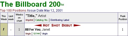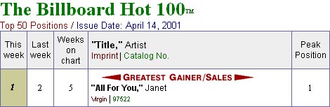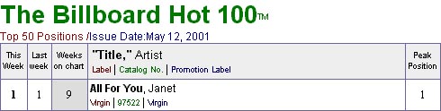 Ya es oficial: All for you es número uno esta semana en Billboard!. Se trata de su décimo número uno en toda su carrera. Felicidades!!!30 - 03 - 2001