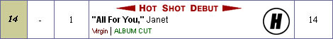 All for you, continúa por quinta semana consecutiva en el número 1 de la lista Hot 100 de Billboard, mientras que el nuevo disco debuta en el número 1 también vendiendo mas de 605,000 copias en su primera semana lo que la hace acreedora a un disco de oro instantaneamente. Por si fuera poco los boletos para su gira mundial se estan vendiendo como pan caliente y en EE.UU. muchos de los conciertos están agotados haciendo que esta gira sea la que mas rápido se venda en la historia de Janet.Con todo esto, Miss J, sigue batiendo records haciendo que su disco sea el que mas rápido se ha vendido en la historia de su compañía (Virgin) y el segundo que mas rápido se vende en la historia por una mujer. Así mismo, All for you es ahora su segunda canción con mayor permanencia en el número 1 (5 semanas) solo superada por That's the way love goes de 1993 que estuvo 8 semanas en el lugar de honor. Por otro lado con el lanzamiento de All for you, Janet tiene ya 5 discos en el número uno de las listas: Control (1986), RhythmNation (1989), janet. (1993), The Velvet Rope (1997) y All for you (2001).