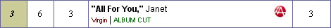 Janet es número 1 por tercera semana consecutiva con All for you en la lista del Hot 100 de Billboard mientras que en la de R&B baja una posición pra quedar en el número 2, detrás de Case y su éxito Missing you. En la lista de Dance sube aceleradamente hasta el número 4.Ya es oficial que el próximo sencillo es Someone to call my lover del cual la próxima semana Janet estará filmando el video que no tendrá bailarines, solo ella.
