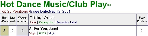 All for you también llega al número uno en el chart de Dance de Billboard, con esto la canción llega al primer puesto en los charts de R&B, Hot 100, y Dance.Al parecer, el reinado del álbum All for you en la lista de los 200 mas vendidos durará poco pues Survivor, el disco de Destiny's child es muy posible que debute en el número uno la próxima semana : (