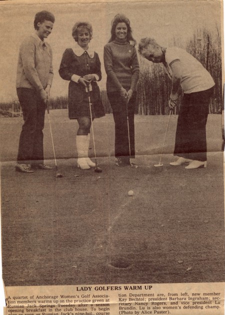 The 1969 annual report was discouraging, as membership was down to 30, and the treasury was down to $56, but Lu Brundin took over the presidency, and revitalized the club. Besides the opening of Russian Jack, Moose Run was unlocking its gates to civilians, and golf was on the upswing for the ladies. the annual Scotch foursome at Finger Lake Resort was another plus for the social side of ladies' golf. New enthusiam was thrown into the picture when the Municipality Golf Committee invited Mary Shreve, Betsy Tower, Kay Bielowski, Barbara Hill, and Patti Collins to serve in July 1983, to scout the site for a 'real' 18-hole PGA-approved golf course. Another member who was instrumental in setting aside open lands, and now has that adjacent park in her name, is Ruth Arcand. The Anchorage Golf Course officially opened on July 1, 1987, with the AWGA Board invited to play as guests of the city officials, and the following day, being a Thursday, was the First Ladies' Day on the course, with 64 ladies playing. (Due to a mix-up, the 65th lady sent her golf clubs around on a golf cart, but did not get to play.)
