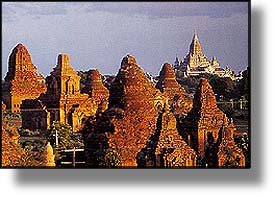To truly experience the splendor of ancient Burma, a trip to Bagan is a must. For over two hundred years, from 1057- 1287, the Burmese kings held court here. Generous patrons of the arts, they adorned their capital with literally hundreds of intricate Buddhist temples and monuments. Although the arrival of Kublai Khan brought the city to its knees, the construction to a halt, and the population to near extinction, Bagan's myriad temples remain. Inle Lake, curdled with lush surface vegetation, is the home of Myanmar's extraordinary leg-rowers. In order to navigate their way through the dense water-plants, the locals stand in the aft of their boats--not unlike Venetian gondoliers. However, rather than using a pole to propel the boat forward, the leg-rowers steady themselves on one foot while using their second leg to row. In addition to its unique mode of transport, Inle Lake is also known for its charming floating villages, Ywama and Phaungdaw, and its floating market. Myanmar Homepage | Asia Homepage | The World |
