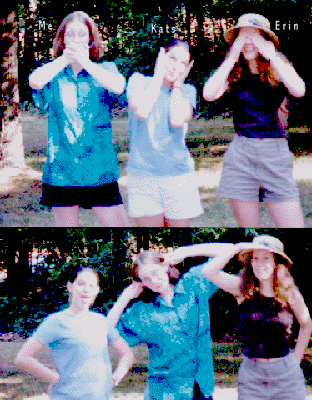 This is me and my two wonderful friends, Kathryn and Erin. We were at my house goofing around - Hear no, see no, speak no evil! But the bottom is our rendition of the way things really are ;)