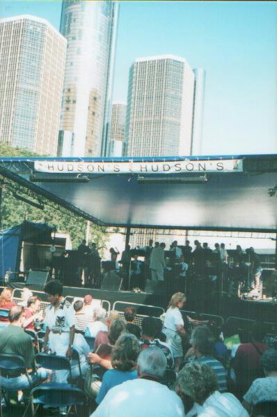 The band plays in front of the RenCen at Montreaux Detroit jazz