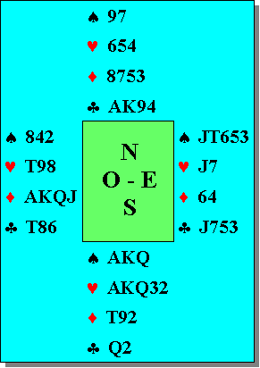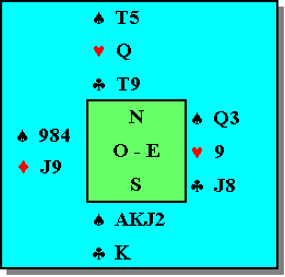 Pur non sapendo che Ovest ha la Dama di cuori, la chance migliore per Est è quella di giocare il Re di cuori alla quarta presa e, se Nord non copre, proseguire nel colore per far saltare l'Asso di cuori.