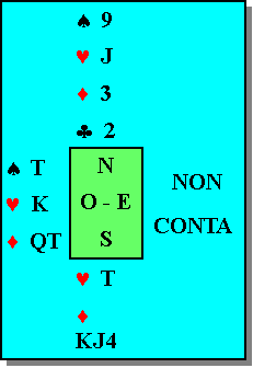 Sud gioca il 9 di fiori, carta comprimente, ed Est è costretto a scartare una carta custodia.