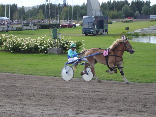 Taluttaessa ei myöskään mitään ongelmia, nätisti kulkee kunhan naru on tarpeeksi pitkä. Jos ihan leuan alta pitää kiinni se voi kyllä kimpaantua ja viskoa nuppiaan aika rajustikin. Ajaessa Puuska kykenee hyvin temponvaihdoksiin ja sillä on hyvä kilpailupää. Se pysyy käsissä mutta antaa kaikkensa jos sitä pyytää. Toki Puuskalla on myös päiviä jolloin liikutaan kuin täi tervassa tai rasvattu salama, mutta yleensä se on juuri sellainen hevonen jonka voisi antaa kenen tahansa ajettavaksi. :) Puuska osaa ratsastuksen perusasioita, väistöt, etuosankäännökset, voltit ja sen sellaiset sujuvat, laukannosto onnistuu kunhan sen nostaa pysähdyksestä tai käynnistä. Muuten vain kiihdyttää raviaan. Sen treenaus tapahtuukin suurimmaksi osaksi selästä maastoillen. Omilla "laukkasuorilla" on hyvä aukoa henkeä ja pitkillä metsäpoluilla käydään kävelemässä ja hölköttelemässä. Myös mäkien kiipeilyä harrastetaan silloin tällöin, kehittyvät selkä- ja takapään lihakset. Lisäksi silloin tällöin kahlaus lumessa tai vedessä on mukavaa vaihtelua.