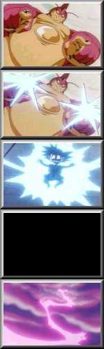 There are actually 3 versions of this. Uu Shinlon's has his fingers pointing out, and firing electricity. Ii Shinlon's first version has clouds in the sky fire a bolt of lightning. While in the second version, he impales someone with his spikes and electrocutes them that way.