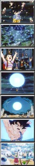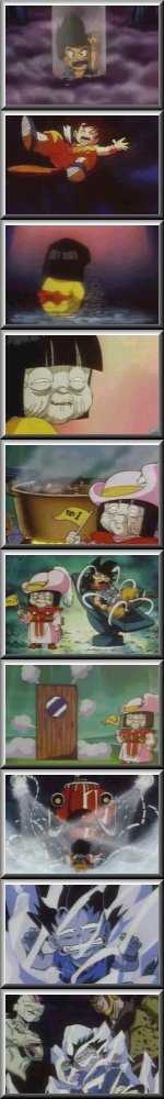 The left pic is basically the Hell Blaster part, while the right pic is the Tour of Hell. Cell and Freeza trap Goku in an energy field, which sends him into the lower depths of Hell. There, he encounters an old woman that takes him on the Tour of Hell. Stop 1 is Soaking Hell, which is just a giant pot of soup on an open fire. Stop 2 is Ticklish Hell, which is a chair that has a bunch of arms to tickle. Stop 3 is Hot Hell, which is a sauna, reaching high temperatures. Finally, stop 4 is Freezing Hell, there's a machine that blasts out Spirit Ice, which traps the dead in a solid block of ice. Ineffective on Goku because he is alive still.