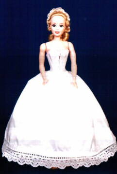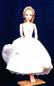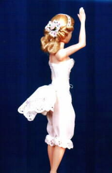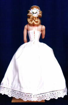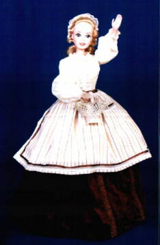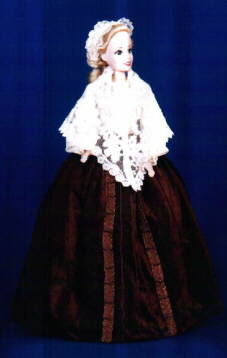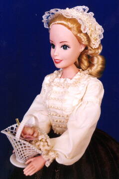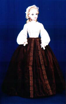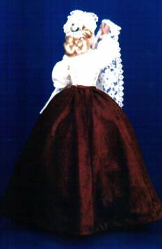 Rosabel is incredibly realistic. She wears a brown velvet gored skirt and an ivory organdi puffed-sleeved-shirt. Her undergarments and costume are historically correct miniatures and include a bustle.