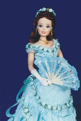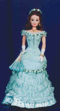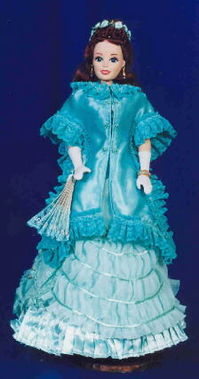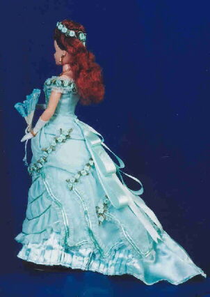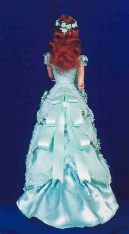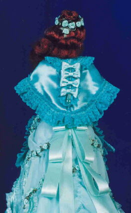 This model is undeniably astonishing!, Sylvia' s beauty is enhanced by this evening dress made of acqua green silk, satin and chiffon. This complex outfit consists of basqued bodice, trained skirt with various over-skirts, 3/4 gloves and flounced cape.