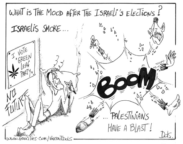 Refused by Boulder Weekly, January 27, 2003.. Maybe the most telling fact in this coming Israeli election is that at this moment of intense crisis, a tiny Israeli party, Green Leaf, which advocates the legalization of marijuana, could win one or two seats in the new parliament. Green Leaf's motto might as well be: since every other solution has been tried and failed, why not just get high? (extracted from) |