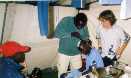 | Everyone joins in to help Samba shave his head bald... got to keep his shinny head nice and smooth. The ladies like it that way! |
