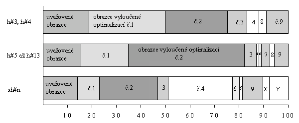 V průměru sítem optimalizací projde v průměru jen 15% obrazců (tj. cca 85% obrazců je v této fázi vyloučeno, což představuje v průměru více jak šestinásobné zrychlení). Dále je vidět, že optimalizace jsou mírně účinnější v sériovotahových pomocných matech.