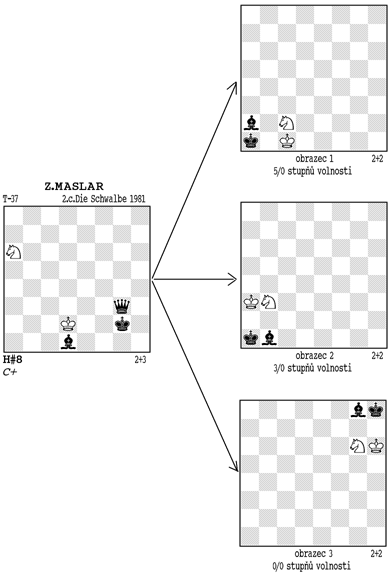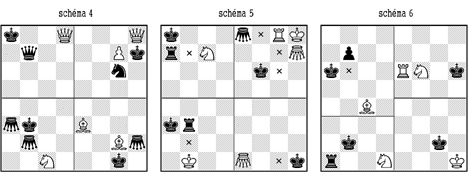 Schéma 5 znázorňuje kostry multiobrazců (vytváření multiobrazců se provádí algoritmem polí). Multiobrazec je obrazec, ve kterém na některých polích není přesně určeno, jaký zde má být kámen, jen je nutné, aby na tomto poli (polích) nějaký kámen stál. Kameny, které obstarají tuto funkci, se vyberou z možných nezúčastněných kamenů s akceptováním aktuálního počtu stupňů volnosti příslušné strany, tj. počtu tahů, který má bílý nebo černý ještě k dispozici. Např. pole b7 musí být obsazeno nějakým kamenem, aby mohl bJc7 matovat (podstatné je, že čVa7 nepůsobí na c7 bodově). Analogicky musí stát na b2 nějaký kámen, aby bílý král nebyl v šachu od čVb3.