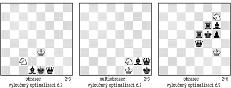 Další 3 příklady obrazců, vyloučených optimalizacemi se vracejí ke dvěma již analyzovaným úlohám. První z obrazců je vyloučen, protože na pole matujícího kamene (c2) působí bodově zúčastněný černý kámen. Ve druhém obrazci působí čDh2 na pole f2 nikoliv bodově, ale přes krátkou linii, tj. vzniká multiobrazec (viz dále) s nutností toho, aby na g2 stál předtím nezúčastněný kámen. Konečně třetí obrazec ze sériovotahové úlohy. Předpokládejme, že pozice čKf5, čSg6 a čPg5 jsou stejné jako v uvažované úloze, tj. že tyto kameny potřebují 4+7+0 tahů. Černému zbývá tedy ještě 14 tahů. Nyní předpokládejme, že čVa4 je v obrazci na e5 a čVf6 vznikla proměnou pěšce a6. Potřeba bylo 2+7 tahů a černému zbývá 5 tahů. Pokud by se černá dáma proměnila z pěšce a5 na poli a1, potřebovala by 6 tahů a tedy tato možnost neprošla již primární fází redukčního algoritmu. Prošla však možnost s proměnou tohoto pěšce na b1, kdy k přemístění na pole e4 je nutných právě zbývajících 5 tahů. Tento obrazec je následně vyloučen až optimalizací č.9, kdy se zjistí, že již neexistuje bílý nezúčastněný kámen (zúčastněný kámen nemůže být brán, protože ten musí být v koncové pozici!), který by mohl být sebrán na b-sloupci. Je třeba si uvědomit, že pokud by byl v počáteční pozici alespoň jeden bílý nezúčastněný kámen, mohl by tento obrazec teoreticky nastat a nelze jej vyloučit. Mohl by však být vyloučen až běhově algoritmem pěšců.