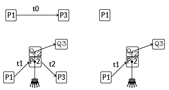 Rozpojovací algoritmus nyní v případě, že jde o zúčastněný kámen stojící na poli P1, který má být v obrazci na poli P3, přináší podmínku, že tato cesta musí být realizována přes pole P2. Rozpojí proto původní cestu a uvažuje 2 cesty: nejprve z pole P1 na pole P2 (v t1 tazích) a následně z pole P2 na koncové pole P3 (v t2 tazích). Evidentně t1+t2 >= t0