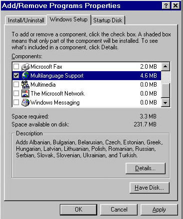 Mnogi korisnici imaju problema sa citanjem cirilice na internetu. Za one koji nisu narocito "familijarni" sa kompjuterom sastavili smo ovo kratko uputstvo za podesavanje racunara za citanje (i pisanje) cirilice. Uputstvo je dato na primeru Win95, ali je i za druge verzije slicno. 1. Otvorite Control Panel i izaberite Add\Remove Programs, zatim izaberite karticu Windows Setup, cekirajte Multilanguage Support i na kraju OK.