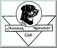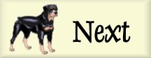| Color-Always black with rust to mahogany marking. The demarcation between black and rust is to be clearly defined. The markings should be located as follows: a spot over each eye: on cheeks: as a strip around each side of muzzle, but not the bridge of the nose: on throat: triangular mark on both sides of prosternum: on forelegs from carpus downward to the toes: on inside of rear legs showing down the front of the stifle and broadening out to front of rear legs fromhock to toes, but not completely eliminating black from rear of pasterns: under tail: black penciling on toes. The undercoat is gray,tan,or black. Quantity and location of rust markings is important and should not exceed ten percent of body color. Serious Faults: Straw-colored, excessive, insufficient or sooty marking: rust marking other than described above: white marking ant place on dog ( a few rust or white hairs do not constitute a marking) Disqualification's: Any base color other than black: absence of all markings. Gait- The Rottweiler is a trotter. His movement should be balanced, harmonious, sure, powerful and unhindered,with strong and a powerful rear drive. The motion is effortless, efficient and ground covering. Front and rear legs are thrown neither in nor out, as the imprint of hind feet should touch that of forefeet. In a trot the forequarters and hindquarters are mutually coordinated while the back remains level, firm and relatively motionless. As speed increases the legs will converge under body towards a center line. Temperament- The Rottweiler is basically a calm,confident and courageous dog with a self-assured aloofness that does not lend itself to immediate and indiscriminate friendship. A Rottweiler is self-confident and responds quietly and with a wait-and-see attitude to influenced in his environment. He has an inherent desire to protect home and family, and is an intelligent , guardian and general all-purpose dog. The behavior of the Rottweiler in the show ring should be controlled, willing and adaptable, trained to submit to examination of mouth,testicles, est.. An aloof or reserved dog should not be penalized, as this reflects the accepted character of the breed. An aggressive or belligerent attitude towards other dogs should not be faulted. A judge shall excuse from the ring any shy Rottweiler. A dog should be judged fundamentally shy if, refusing to stand for examination, if shrinks away from the judge. A dog the, in the opinion of the judge menaces or threatens him/her, or exhibits any sign that it may be safety approached or examined by the judge in the normal manner, shall be excused from the ring. A dog that in the opinion of the judge attacks any person in the ring shall be disqualified. |