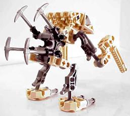 | Granite now has two of everything, including an extra head! Out of all the Ultra Throwbots, Granite has changed the most. He now stands up-right. His hand augers and back pick axes allow him to tunnel through the ground faster than ever. He can dig a mile long tunnel through a mountian in under a minute. Ultra Granite loves his new form, and so does he! |