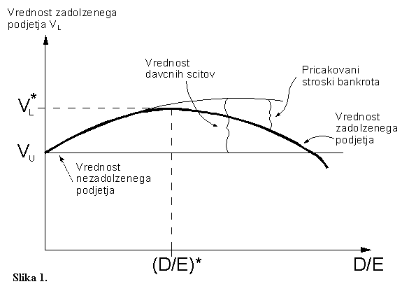 kjer je VU vrednost podjetja, v kolikor bi le-to bilo nezadolzeno. Situacija je ilustrirana na sliki 1, kjer je prikazana vrednost podjetja (VL) v odvisnosti od njegove zadolzenosti, oziroma od razmerja med upniskim in delniskim kapitalom (debt-to-equity ratio ali D/E). Iz slike je razvidno, da pri nizki zadolzenosti podjetja davcni prihranki odtehtajo pricakovane stroske stecaja in zato v tem obmocju vrednost podjetja z zadolzenostjo narasca. Ce pa se podjetje zadolzi cezmerno, zacne njegova vrednost z zadolzenostjo upadati. Po kompromisni teoriji je za podjetje najbolje, da se zadolzi ravno toliko, da so mejni pricakovani stroski stecaja enaki mejnim davcnim prihrankom. Na sliki je ta tocka oznacena z (D/E)*, vrednost podjetja ob tej optimalni zadolzitvi pa z VL*.