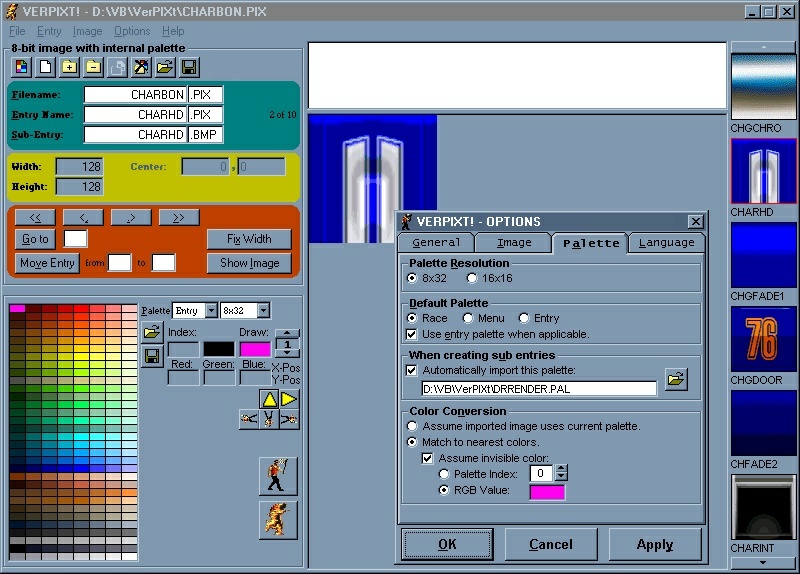 Carmagedit will let you export / import graphics, but it can only edit existing graphics and cannot resize image dimensions. Well, QTZ finally talked me into writing a program that does resize PIX files. So now we've got a great functioning PIX generator, and we're just working out the kinks, adding miscellanious features, and making it look generally barable to the eye. I call the program “VERPIXT!” because it's a PIX editor, and the name sounds like the German exclamitory “verflixt!” and mind you, lots of choice words come to mind when you're trying to develope a program on a 7-year-old P200 that keeps crashing and reseting itself, no matter how many times you reinstall Windohs on any given day. (I've been in Silicone Hell ever since I installed that crappy Visual Basuck MSDN Help Library.)
