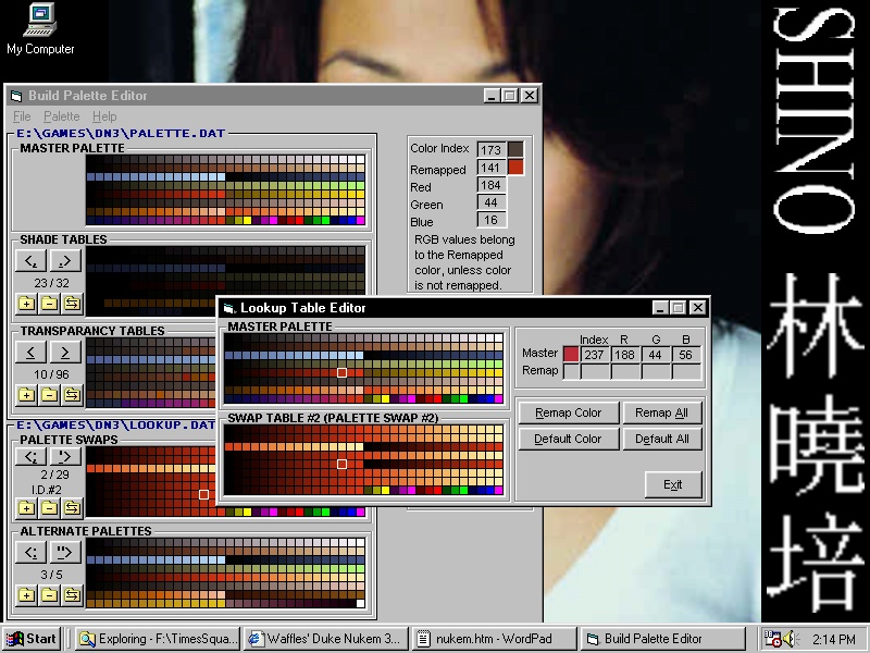 I extracted the elusive color palettes for Duke Nukem 3D's title screen and first ending cinema. (I hope to make the program I wrote available soon!) Now I've got these two scenes set as my start-up and shut-down logos for Windohs '98. I didn't bother with the Shutdown-Safety screen because my computer always freeze before it can get there. (The ONE time it did, the registry was currupt when I restarted.)