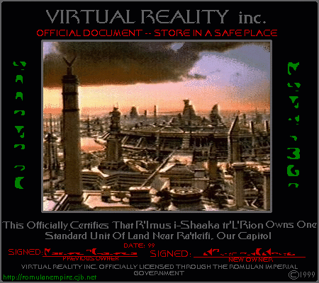 ......The capital city of ch'Rihan, the grandest city in the entire Romulan empire, is known in the archaic Romulan tongue as Val'danadex Trel or in the modern idiom as Ra'tleighfi. Originally just a village springing up where the first Romulan settlers landed, Val'danadex Trel was rebuilt as a more planned and structured community over a thousand years ago in order to better suit the Romulan sense of organization, efficiency, and grandeur. Many of the city's magnificent architecture dates from this time of renewal.