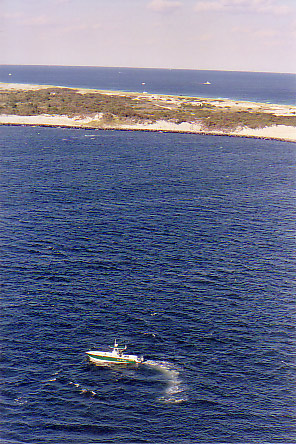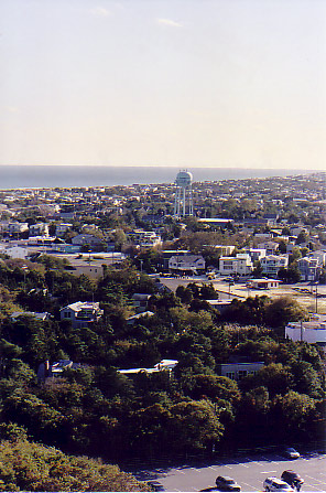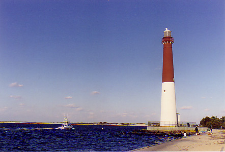 enters Barnegat Inlet on its way out to sea, while the right-hand picture shows the lighthouse from the ocean side; this photo was taken on a 1998 visit.