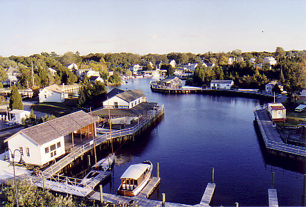 during a severe 1927 storm. On the right is a view from the top of the lighthouse of Tuckerton Creek, with the buildings of the Tuckerton Seaport complex