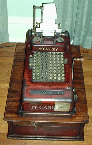 | McCaskey Register Company AMOD style cash register This machine is quite like the one seen earlier and which belongs to my wife. This one belongs to the both of us, and was a gift from my father. What's really unusual about it is the woodgrained paint applied to the mechanical, or adding machine, portion of the register. I myself only recall having seen one, or maybe two of these before (and only one in person.) This variant is thus quite rare. The special keys on the left row indicate that this machine was configured for use in a butcher shop. Keys for beef, veal and butter are among the items included. You are seeing it here in as-bought condition, prior to any cleanup or inspection. One important fact though is that it is completely operational and has its keys. |