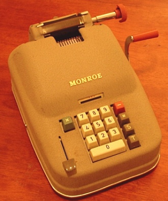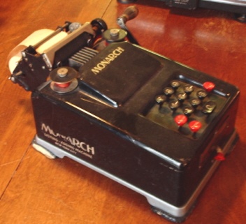 | MONARCH LISTING ADDING MACHINE Readers of my site will find fairly extensive coverage of Monarch Typewriters, and the history of the company that built them. This little machine actually has nothing to do with the Monarch Typewriter Company, except in the sense that Remington ended up completely merging Monarch and re-using the name on typewriters and other products. This 10-key crank-driven adding machine is actually a Remington-Rand product, but which unusually (for adding machines) carries the Monarch brand name. |