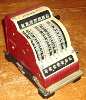 | RESULTA 7 German-made stylus-operated adding machine with subtract feature. The pen-sized stylus can be seen in the side clip provided to hold it, giving an idea of the size of the machine. The stylus actually has an end which operates the pull-down racks of the machine itself, with the rest of it being a mechanical pencil! |