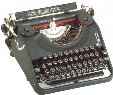 | "Standard Model MERCURY" s/n 40155 Tilman Elster collection A previously unremarked relabeling of the later Weedsport era BARR machine, finished in overall crinkle paint with black keytops. Note the winged-foot emblem on the paper table. Machine has US keyboard; exact origin of label unknown. |