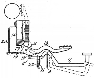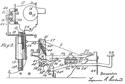 | At right we see an early design for removable type-basket portables, by Lyman C. Roberts. This design apparently was developmental and was not produced. Note that at point 11 an extension of the key lever contacts and pushes type bar 12 but has no positive mechanical connection with it. |